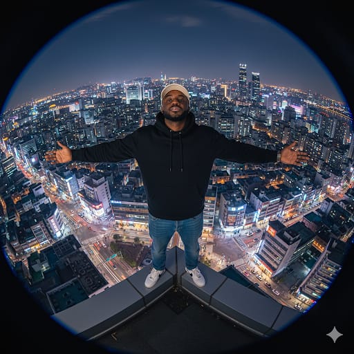 Change the background standing to the edge of a very tall skyscraper in the middle of a South Korean metropolis. He wears a plain black hoodie, blue jeans, a cream baseball cap, and white Nike sneakers. His arms are wide open, as if he's reaching out for a sense of freedom. The wide-angle camera captures a panoramic view of Seoul from above the bustling streetlights and the sea of glowing buildings are visible. The camera's perspective is from above, and the 360⁰ wide-angle lens effect creates a dramatic perspective, highlighting the elegant and majestic urban atmosphere at night. Citylights, neon rooftop lights. Modern, calm, and fashionable, with a metropolitan nighttime feel, tense yet cool, with natural nighttime lighting and sharp details like a DSLR photo. High resolution, 4:3 landscape ratio