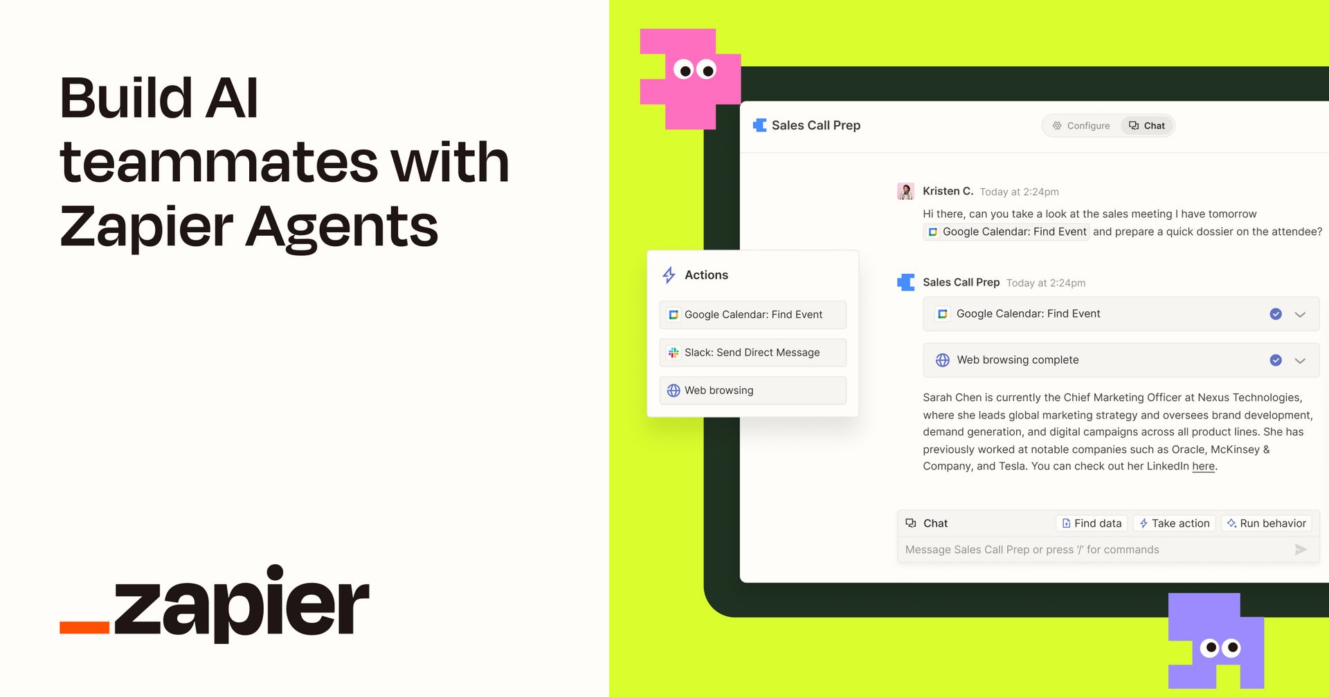 Most tools automate tiny tasks. Zapier lets you build AI agents that do the real work. This works because you can connect with over 7,000 apps from email to calendars to CRMs and more, and the best part is that it lets you get started by just chatting or building from scratch with no coding needed. You define what you want done.